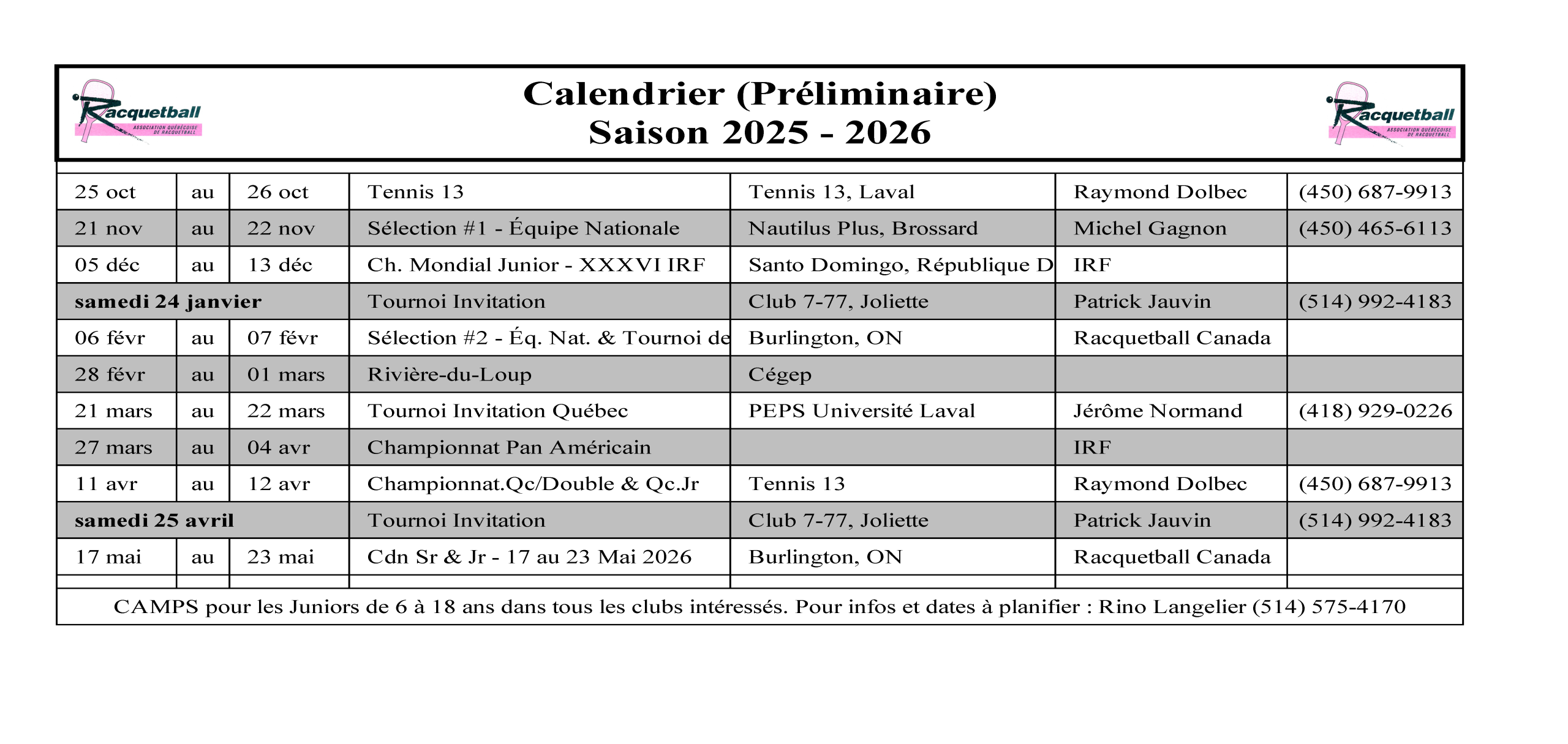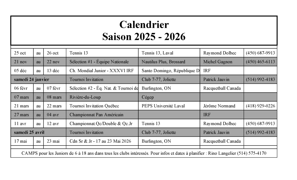 Ces résultats sont régulièrement mis à jour par Racquetball Canada. L’Association Québécoise de Racquetball se charge de les publier dans tous ses clubs membres.